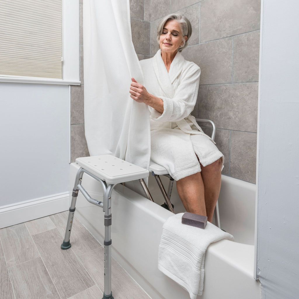 Transfer benches provide stability to an individual with limited balance and mobility allowing an individual to bathe comfortably and safely. While transfer benches today offer support and stability, water from the shower can spill out onto the bathroom floor putting both the user and care taker at risk of slips and falls. Shower curtain liners are displaced outside the bathtub as the transfer bench hinders it from catching water and keeping it inside the tub. Drive DeVilbiss continues to enhance the quality of life by introducing the new Splash Defense Transfer Bench! The Splash Defense Transfer Bench is unique and the first of its kind allowing your shower curtain liner to remain inside the bath tub. This product enhancement meets the needs of so many by helping eliminate water from spilling out onto the bathroom floor, creating a danger zone for not only the user but also for the care taker. The Splash Defense transfer bench provides security for the care taker, while giving an individual their independence back and allowing them to bathe safely and privately again.