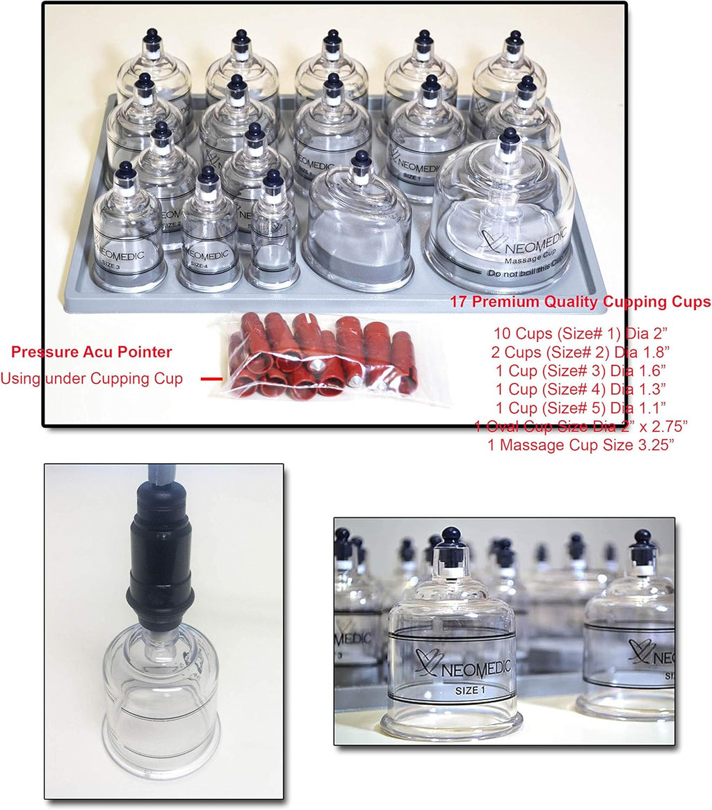 • All Complete 38 cups include 10 Pressure Acu Pointer. 17 Premium Cupping Cups (7 Size), 3 set XX Large, X Large, Large (2 each), 3 set Large Longneck, Medium, Small (2 each), 3 set Large Gourd, Medium, Small (2 each), L, M, S size Fingertip Moving