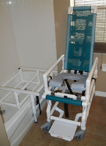 It is a 2 part system. You have the rolling chair and the stationary tub unit. The rolling bath chair/shower chair interlocks with the tub frame, which is stationary in the bath tub. When detached from the tub frame, the rolling chair can be positioned over a standard toilet commode and then without even one transfer from the seat, can be placed next to the bathtub, interlocked to the tub frame, and slid right into the bathtub. After the transfer is made into the tub, the rolling chair can then be removed so the caregiver can help with bathing. When bathing is complete, simply reposition the chair next to the tub, interlock it with the support frame, and slide the bath chair back onto the rolling chair. Once locked in place, the rolling shower chair can then be rolled away from the bathroom.
