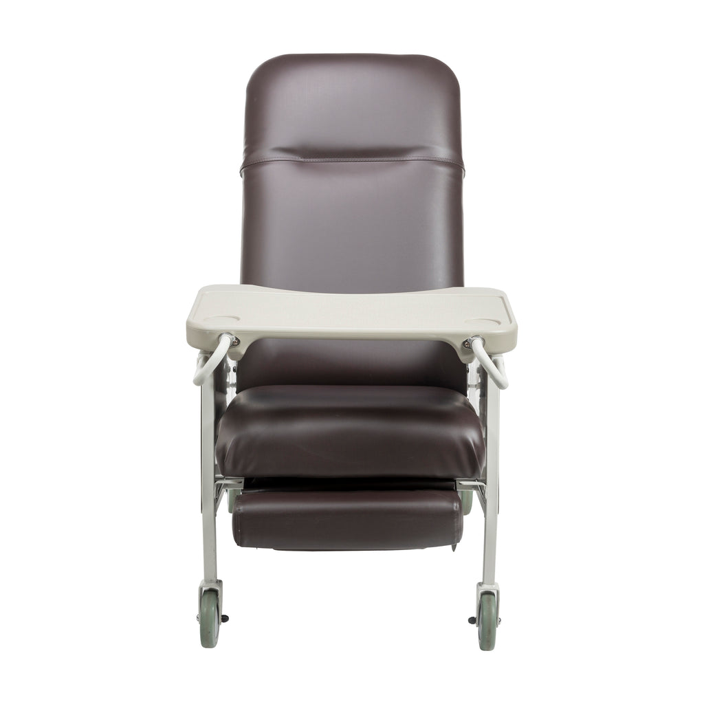 With three comfortable positions, retractable lock bar, self-adjusting suspension and a convenient tray, this 3-position Geri chair recliner by Drive Medical includes a bevy of features. It can be positioned upright, in a deep recline or with the leg rest/footrest elevated, and a retractable lock bar secures the chair in your desired position. The self-adjusting suspension prevents the problem of the user "bottoming out" in the seat, which is protected from seepage by a moisture barrier. The product includes a large, blow-molded tray that locks in 5 positions and can be stowed away on the side of the chair. The comfortable "built-in" headrest and wide, comfortable, padded arm rests were constructed at an angle to provide support, even in a reclined position. The 5" casters (2 complete with locks) allow for simple movement and security of the recliner. The neutral colored, sturdy steel frame is easy to clean and maintain, with side panels that pop off for cleaning and maintenance. All foam and vinyl meet California Flammability standards, and the product also meets both standard and Boston Fire Department specifications. Comes available in the following colors: blue ridge, jade and rosewood.