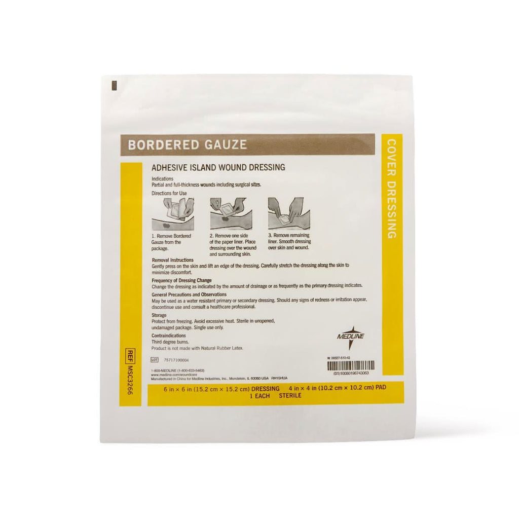 - Description: Medline Bordered Gauze: Medline Bordered Gauze is an absorbent island dressing constructed with a heavy-duty soaker and conformable, non-woven fabric adhesive backing. This product is the perfect dressing for surgical incisions, superficial lacerations, abrasions, stage I-IV pressure ulcers, partial and full-thickness wounds, infected and non-infected wounds. Sterile. 6" x 6", 4 1/4" x 4" pad.