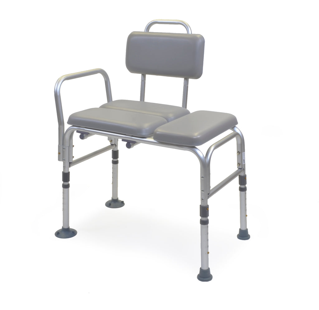 The ProBasics Padded Transfer Bench helps make transfers in and out of the bathtub safer and more comfortable. Constructed with an aluminum anodized frame and padded back and bench, it features a reversible back for right or left handed transfers. The angled legs have one-inch, easy-snap button adjustments and wide-based, non-skid feet for added sturdiness and safety. Tool-free assembly and limited lifetime warranty are standard.