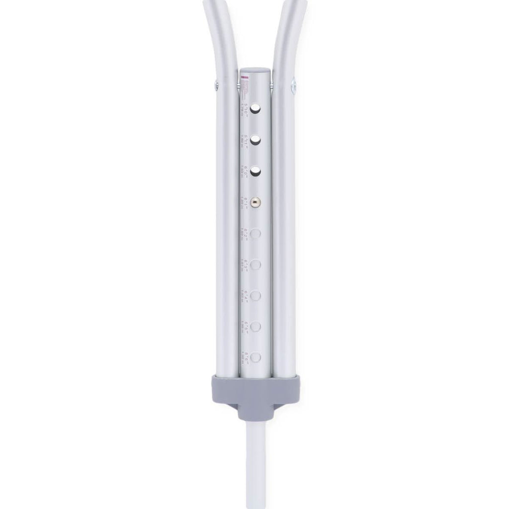 - Standard aluminum crutches feature a double extruded center tube that provides load-bearing strength where it's needed the most
