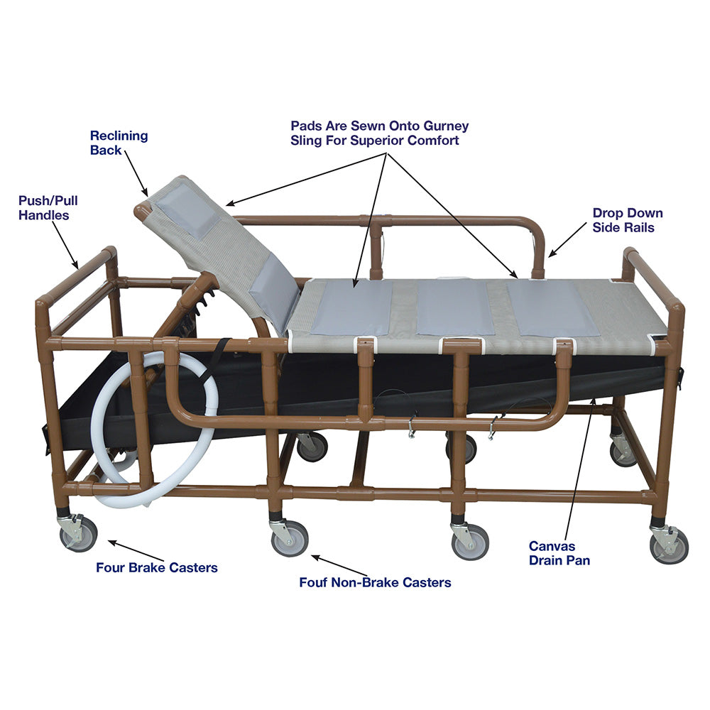 Healthcare Grade, Reinforced At All Stress Related Areas, Shower Gurney With Five Position Elevating Headrest, Canvas Drain Pan And Hose, Dual Drop Side Rails.