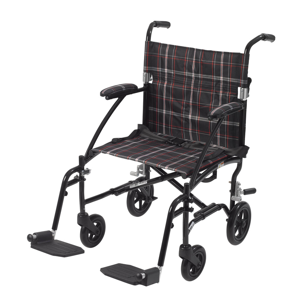 The 19" Fly Lite Ultra Lightweight Aluminum Transport Chair by Drive Medical, available in a variety of attractive colors, is an ultra light transport chair, weighing under 17 lbs without riggings. This transport chair comes with a stylish aluminum frame and is available in blue plaid, black/white/red plaid, or black nylon upholstery. It is also durable and easy to clean. Comes standard with a carry pocket on the back rest to easily and securely transport personal items, seatbelt for added safety, and tool free, height adjustable swing away footrests. The deluxe back release allows the back to be folded down easily, making the chair easy to store and transport.