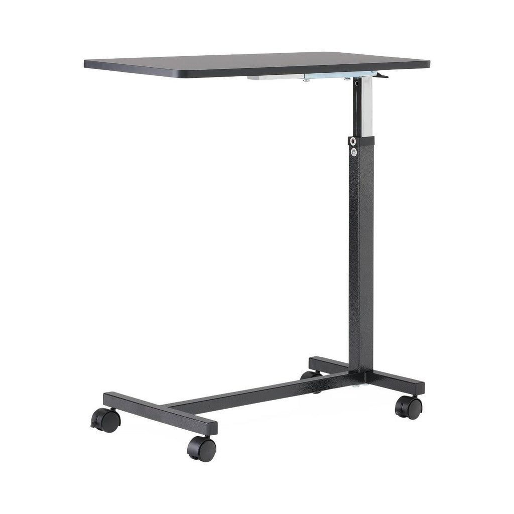 • Description: Walnut Laminate Overbed Table: 30" x 15" (76 x 38 cm) top with walnut wood grain melamine laminate with a T-mold edge. Automatic spring lift mechanism adjusts height from 28" to 45" (71 to 114 cm). Chrome-plated column and base. Holds up to 50 lbs (23 kgs).