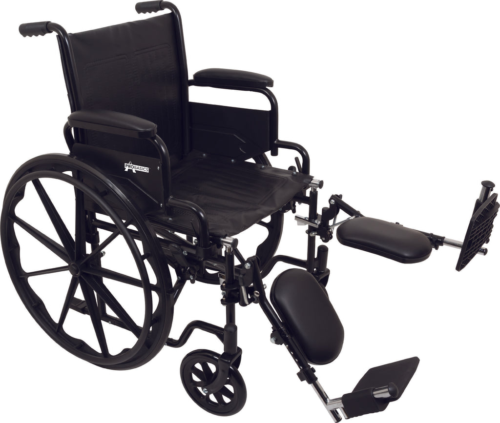 The ProBasics K1 Manual Wheelchair combines style and durability at an affordable price. Standard features include flip back removable padded armrests, easy-to-clean vinyl upholstery, chart pocket and heel loops on the front riggings. Supporting patient weights up to 250 pounds, the ProBasics K1 Standard Wheelchair is a popular choice among providers. Available with swing-away footrests or elevating legrests.