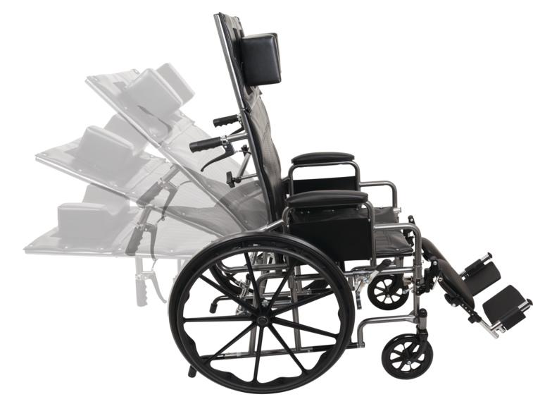 The ProBasics Reclining Manual Wheelchair provides full back and headrest support as patient reclines from 90 to 160 degrees. The 13-inch headrest and padded, full-length arms are removable. Black, easy-to-clean, comfortable vinyl upholstery that accommodates a wide range of users. The frame has a chip-resistant silver vein finish. Mag-style wheels are lightweight and set back on frame to prevent patient from tipping when in the reclined position.