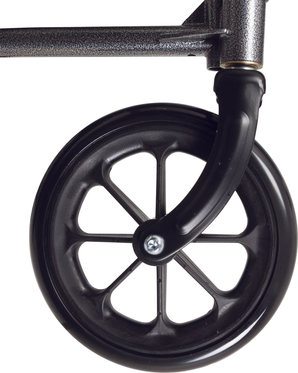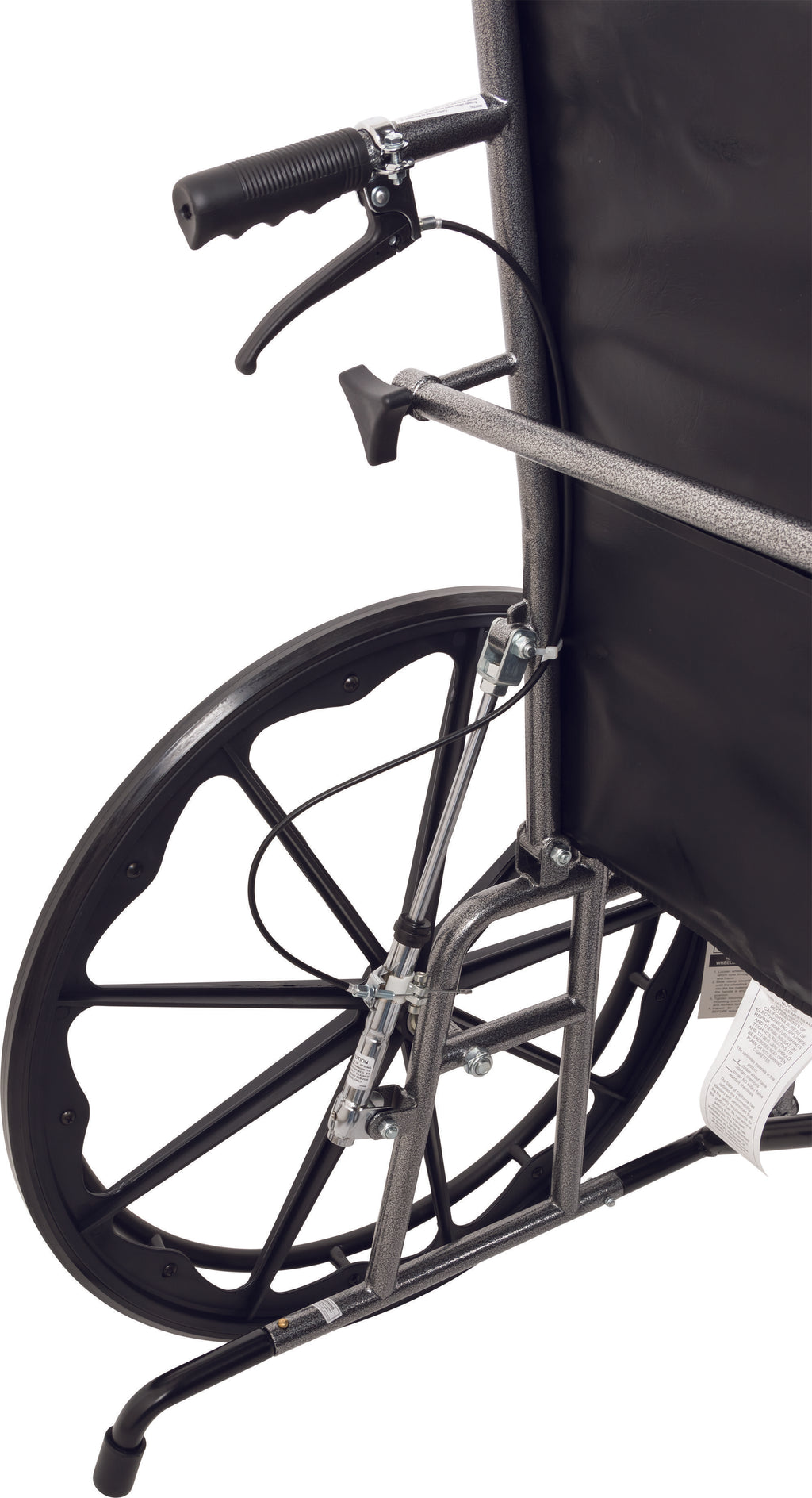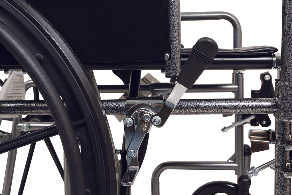 • Slide tube steel frame with an attractive silver vein finish that is chip resistant and easy to maintain. Rear anti-tippers and Easy push-to-lock wheel locks come standard.