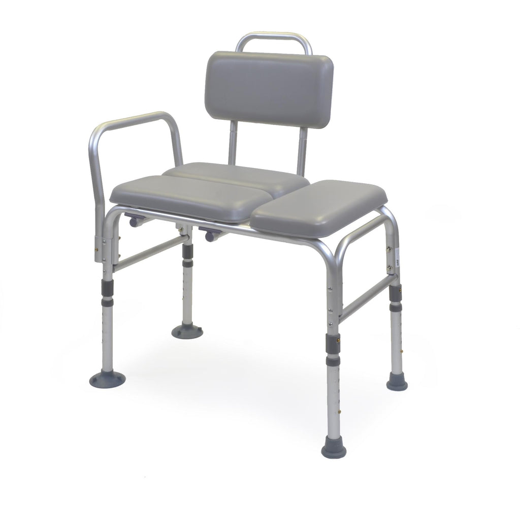 The ProBasics Padded Transfer Bench helps make transfers in and out of the bathtub safer and more comfortable. Constructed with an aluminum anodized frame and padded back and bench, it features a reversible back for right or left handed transfers. The angled legs have one-inch, easy-snap button adjustments and wide-based, non-skid feet for added sturdiness and safety. Tool-free assembly and limited lifetime warranty are standard.