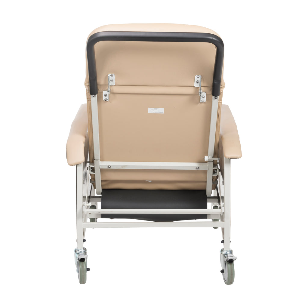 With three comfortable positions, retractable lock bar, self-adjusting suspension and a convenient tray, this 3-position heavy duty bariatric Geri chair recliner by Drive Medical includes a bevy of features. This bariatric model is extra strong, able to withstand a weight capacity of 500 pounds. The chair can be positioned upright, in a deep recline or with the leg rest/footrest elevated, and a retractable lock bar secures the chair in your desired position. The self-adjusting suspension prevents the problem of the user "bottoming out" in the seat, which is protected from seepage by a moisture barrier. The product includes a large, blow-molded tray that locks in 5 positions and can be stowed away on the side of the chair. The comfortable "built-in" headrest and wide, comfortable, padded arm rests were constructed at an angle to provide support, even in a reclined position. The 5" casters (2 complete with locks) allow for simple movement and security of the recliner. The neutral colored, sturdy steel frame is easy to clean and maintain, with side panels that pop off for cleaning and maintenance. All foam and vinyl meet California Flammability standards, and the product also meets both standard and Boston Fire Department specifications. Comes available in the following colors: blue ridge, jade and rosewood.