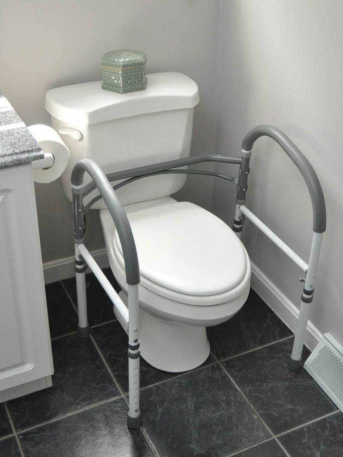 The Bathroom Safety Rail stands on its own without installation, so it can be used for added safety and stability all over the bathroom.  The Bathroom Safety Rail easily fits around your toilet to provide safe support and assistance while sitting down or rising from the toilet.